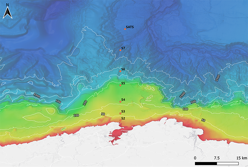 La estación oceanográfica que junto con la boya AGL conforman el observatorio SATS, es la estación más profunda del Radial de Santander. Muestreada durante las campañas RADCAN hasta más de 2500 metros de profundidad.
